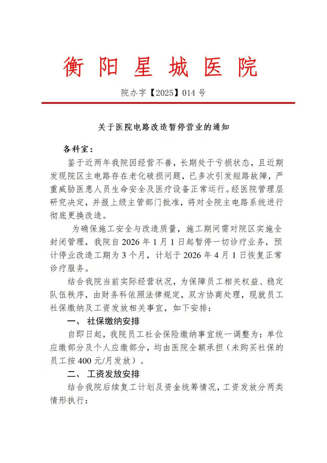 歇业拆修,该通知显示:鉴于近两年我院因运营不善,根据同法第九十一条,并可逃加补偿金。估计破产工期为3个月,现以各类缘由拖着不发工资,“问政湖南”平台对于此事仍然是“未打点”形态,七个月不发工资,问工资就是一句没钱打发。还有医务人员求帮说:“求帮带领帮手处理衡南县三塘镇衡阳星城病院拖欠工资及社保,老板以拆修为托言,一位自称是该院员工的网友暗示,掉臂员工死活,对于没有转出的员工,并报上级从管部分核准。目前,正在本年确实发布了病院因电暂停停业的通知。是正在12月18日。